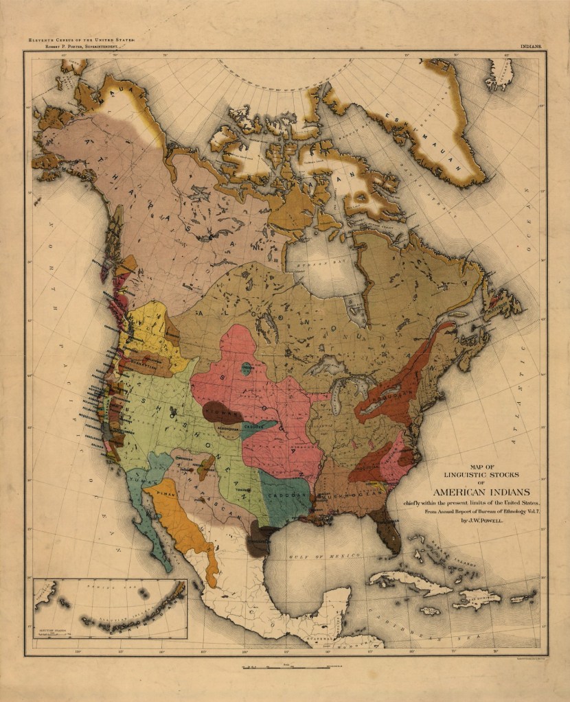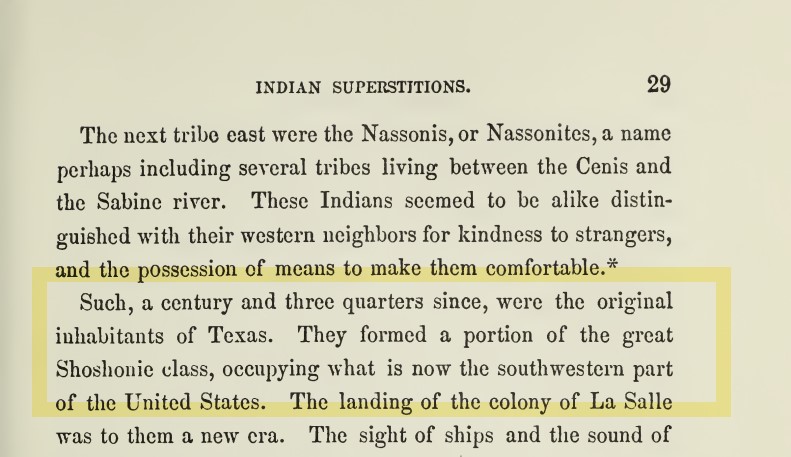 Yoakum names the Comanches, Lipans, Karankawas, Cenis, and Nassonis as aborginal inhabitants of Texas and claims they are apart of the great Shoshonie class of Indians. So, although I don’t agree with some of the things Yoakum says about the Shoshoni, I do see a pattern for pre-1885 texts referring to the extent of land from the Columbia river in the modern northwest USA and how thru linguistic classification or disclassification, eastern Texas Shoshoni were classified either with the Caddo Indians or another neighboring/allied tribe, like the Comanche. But from the first map shown, the Shoshoni inhabited a large portion of the Cental and Southwestern lands of the modern United States of America.