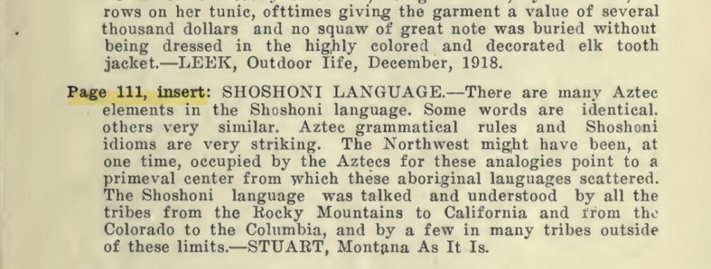 There are many connections between the Shoshoni/Chuchone and the so called Mexcia/Aztecs. The Shoshoni were known as the Teka, Techos, Tejas, Texia, Chochos or Cocos, in the Neches and Angelina rivers region of modern day Texas. Here are some noteworthy text materials discussing the Shoshoni: