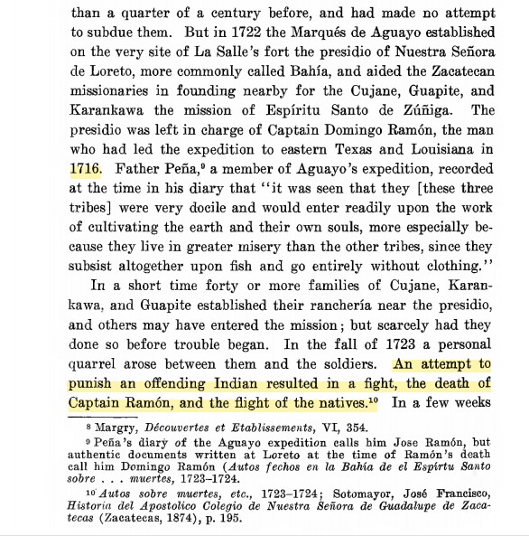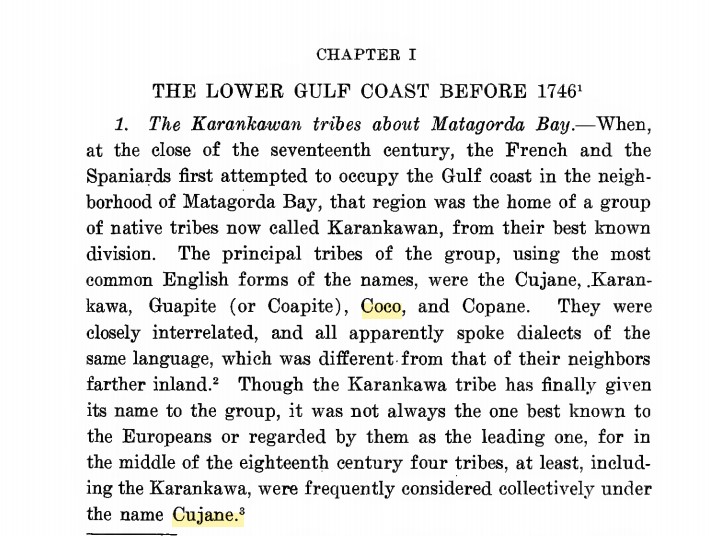 On pages 283-284, Bolton describes the attempts of the Spanish and French colonizers to subdue and convert the tribes living on the coast. He sites multiple reasons, but it seems the Coco or another coast tribe, under a pre-1746 name, such as Caocosi, gave the invaders a good fight. See below.