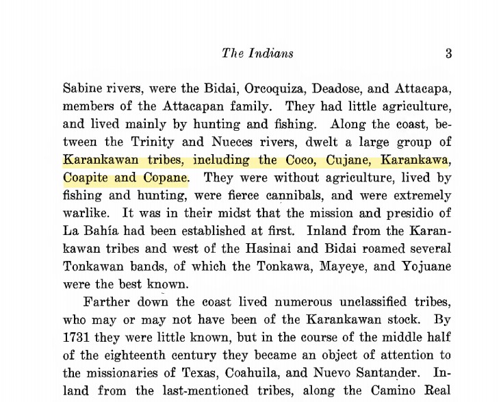 The south Texas coast tribes known as Karankawa today were referred to as Cujane or Coxanes before 1746 according to Bolton’s report, pgs 281-282. See below. This label, Coxanes, will lead to more posts and discussions on the possible connection of the Coco, Chocho, Tecos, Tecoxines, Karankawa, Shoshoni, and the Southeast Woodland tribes. I’m also investigating the placename, Texcoco.