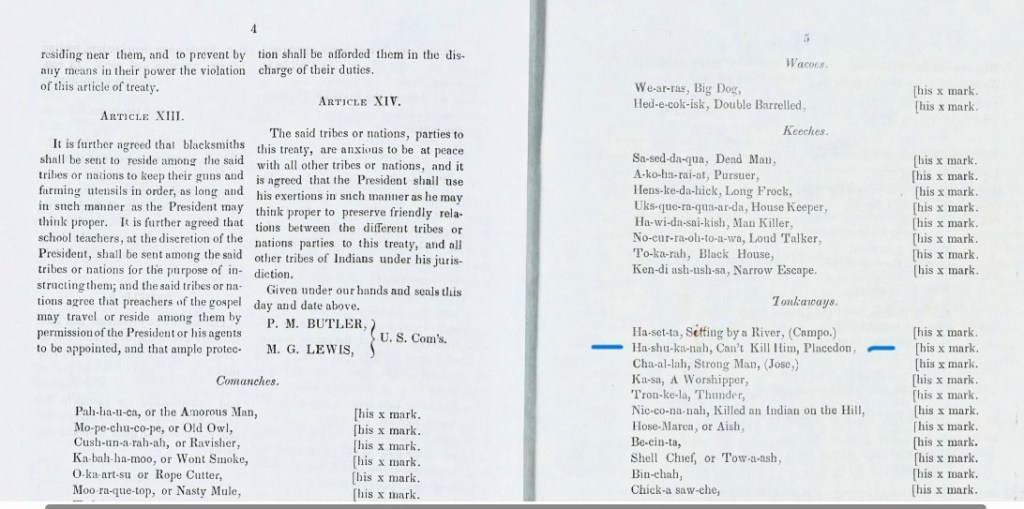 His name apparently speaks for himself, Hashukanah, in English- Can’t Kill Him, also a spanish language name of Placido who may also be Placido Benavides written in Mexica and Texas history. He was apart of a treaty signed with the United States on 15 May 1846 and ratified on 8 March 1847. See below.