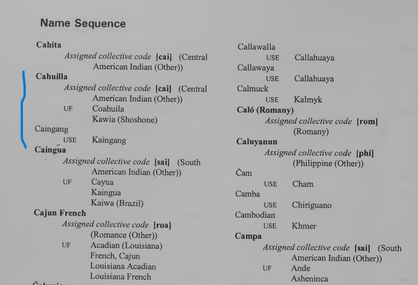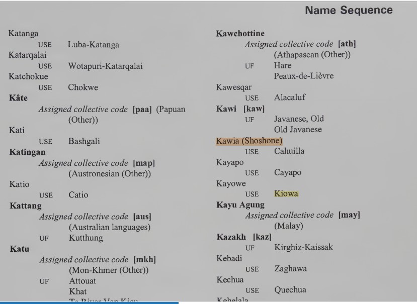 The Shoshone is a bit different in the 2000 MARC code book. It’s presented in () as the Kawia under the Cahuilla-Coahuila and Kawi-Old Javanese headings. The modern state of Texas was known or classified as Coahuila y Tejas in the mid 1820s before the so-called Texas Revolution and war. The Old Javanese reference is interesting because in the Central American Indian (Other) list, there is a language called Huave. Texas was also referred to as Nueva Filipinas by the Franscican and Domincan Jesuit militia in the 1700s. There are many implications from the MARC 2000 text on the shifting/transplanting/removal/replacement of Shoshoni history to different continents/nations/countries instead of the Americas. According to Brittanica online, “Java” fell to the British East Indian company force under somebody named Baron Minto in 1811. The truth of this narrative is not my interest, but it is interesting to me that 1811 is the year the war called Tecumseh’s War started. More on this in a future post.